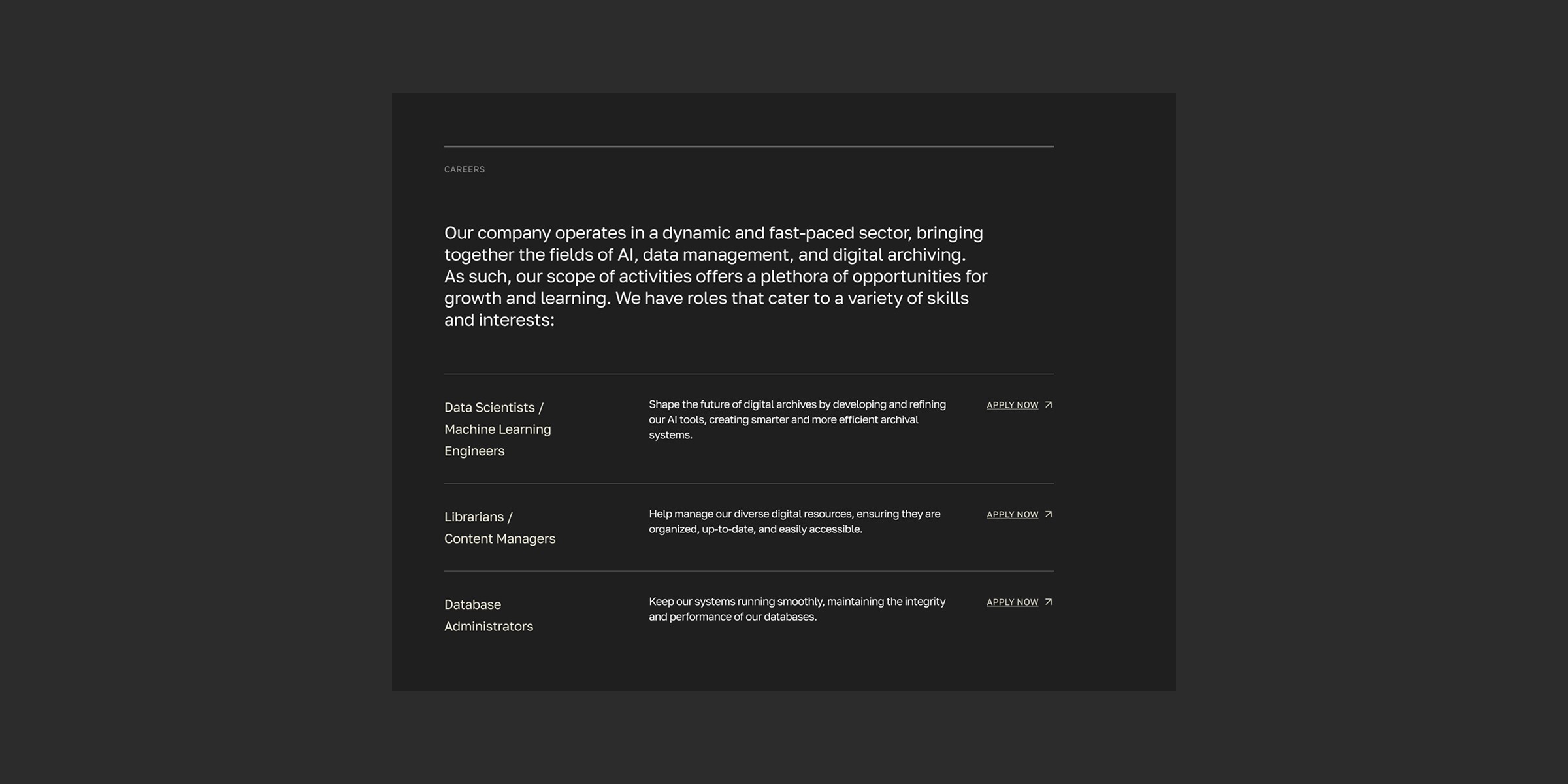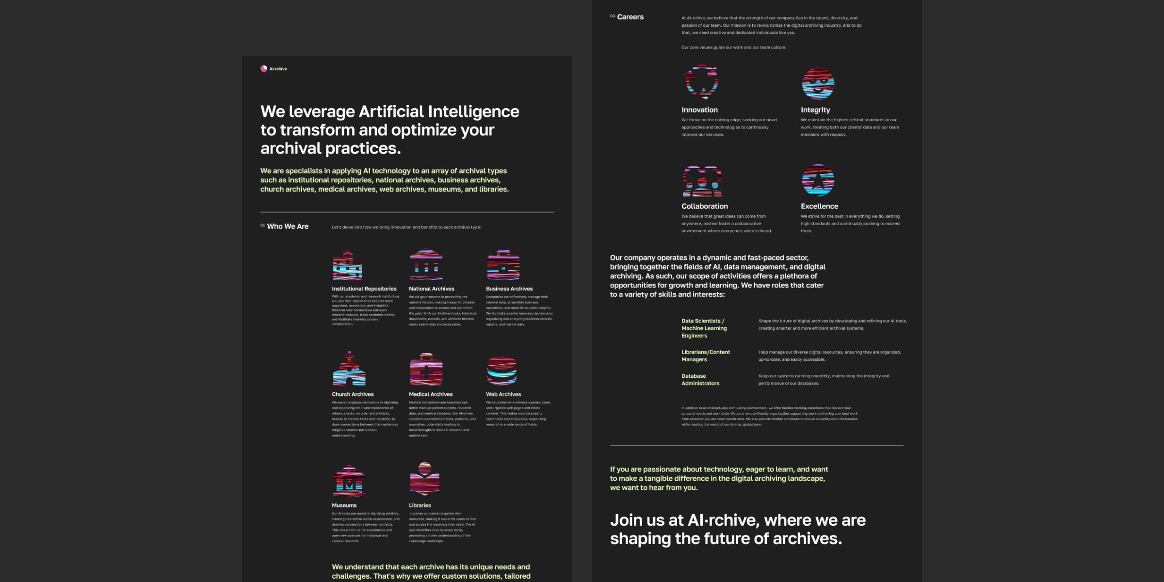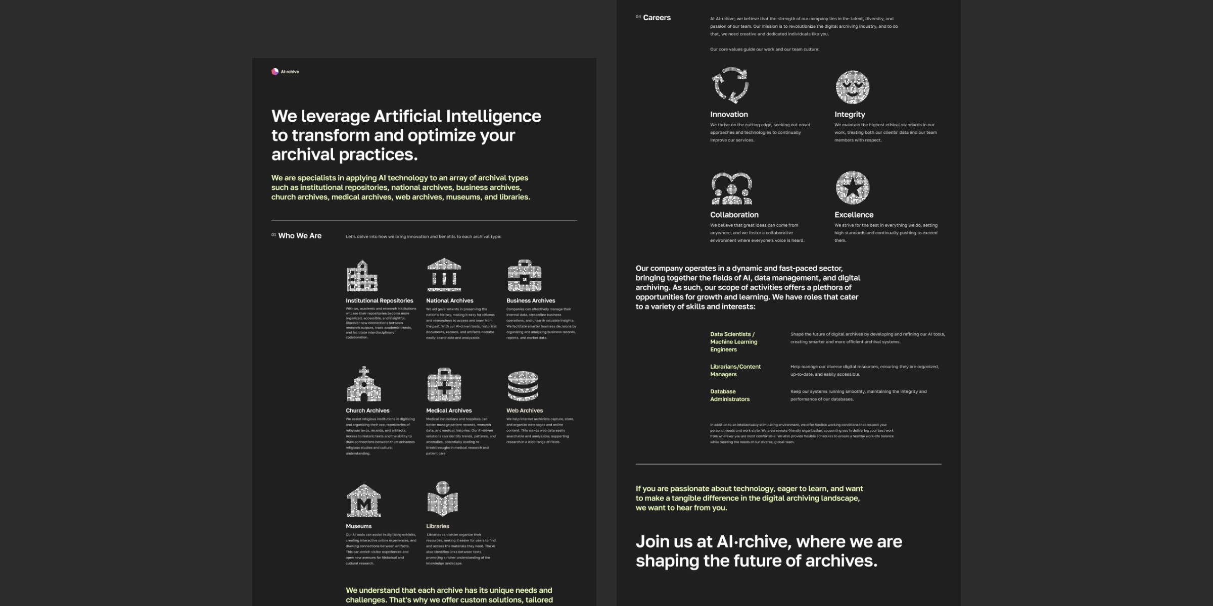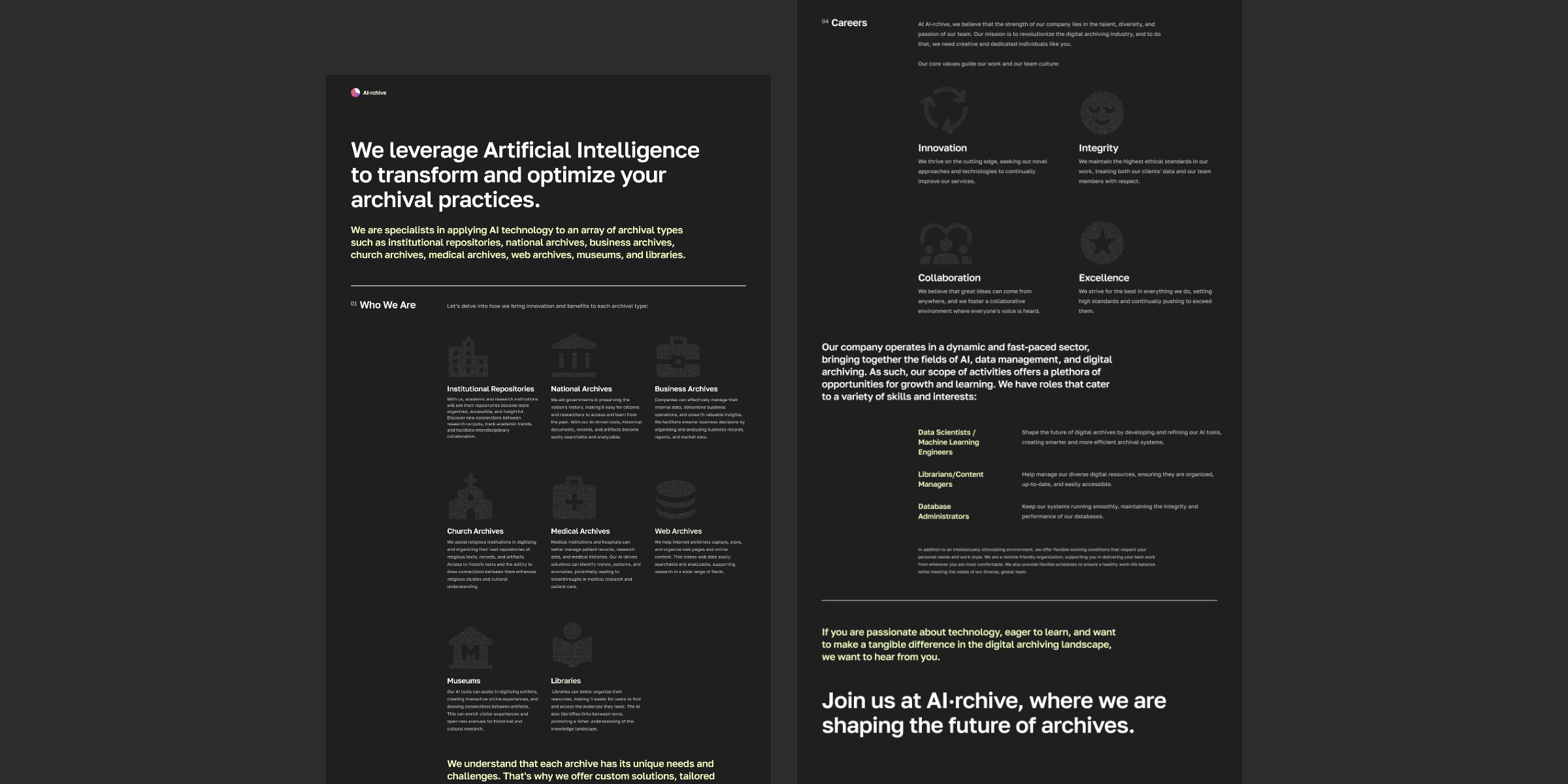 Led the end-to-end product design for the AI·rchive career website. The primary objective was to craft a modern digital platform that goes beyond a traditional job board, acting as a powerful employer branding tool to attract top-tier tech talent by showcasing the company's innovative DNA and core values. In the highly competitive AI talent market, standard, text-heavy job listings fail to engage high-caliber professionals. The challenge was to design a compelling digital experience that instantly builds trust and communicates technological leadership, while keeping the job discovery and application process as frictionless as possible.
