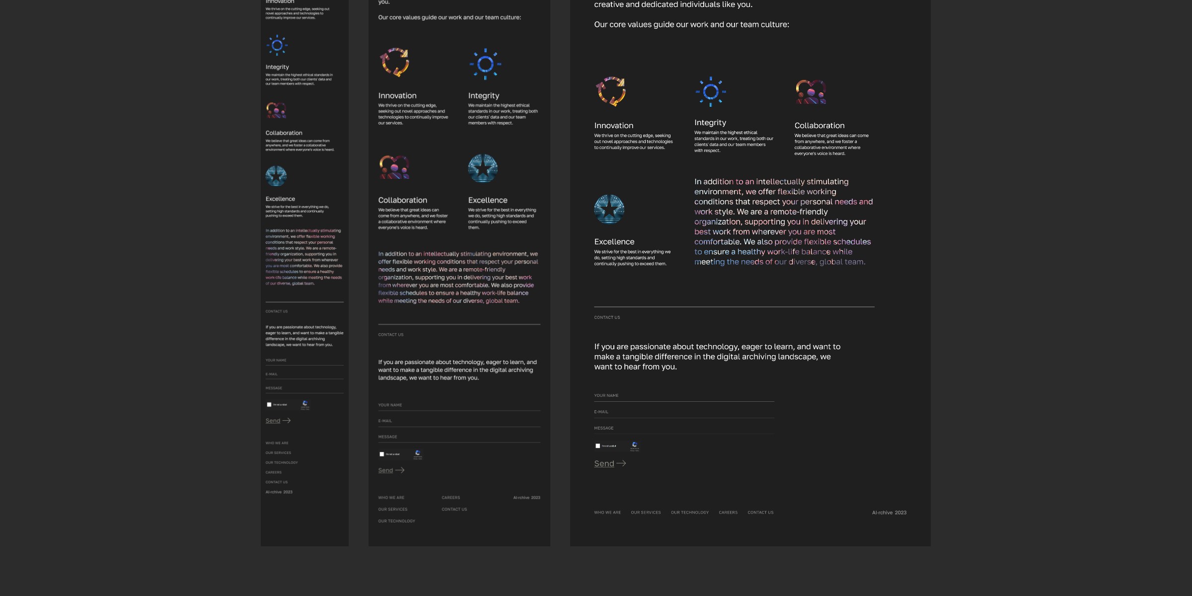 Developed a clean, minimalist visual language anchored by bold typography, strategic use of negative space, and premium visual assets. This approach establishes a confident, forward-thinking brand identity. Integrated fluid micro-interactions and smooth state transitions to bring the interface to life. These nuanced details elevate the overall user experience, reflecting a deep commitment to quality and pixel-perfect design. Delivered a fully responsive, aesthetically driven, and conversion-optimized career platform that significantly strengthens AI·rchive's HR brand.